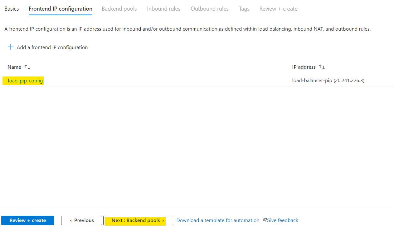 When the load balancer is deployed click on Go to resources. You will see the IP address for the load balancer. If not click on See more in overview.
