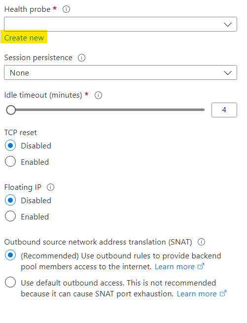 Now scroll down a bit and you will see and option for health probe. Click on Create new.