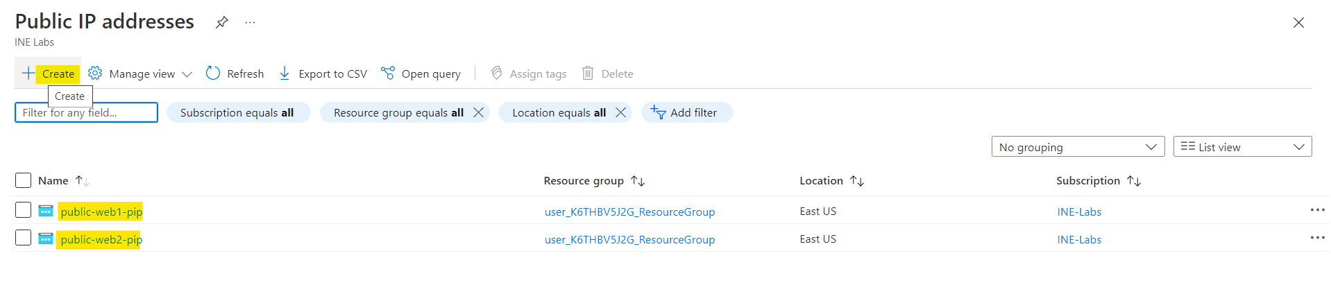 Here click on create to provision a new public IP address in our resource group. You can also see there are two public IPs for the VM already.