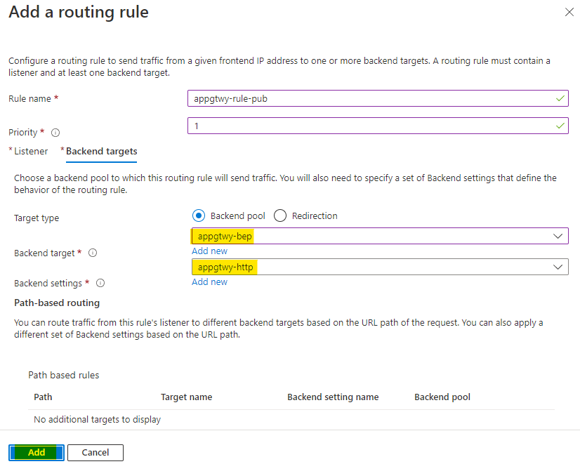 Also you will use the same backend setting you created for public rule. Click on Add to add the private routing rule.