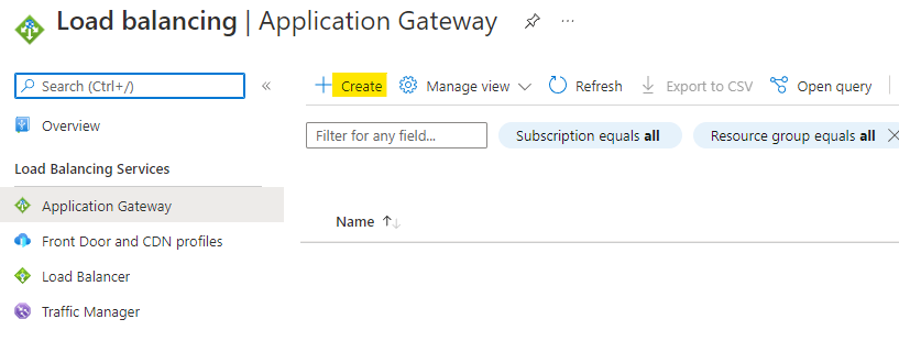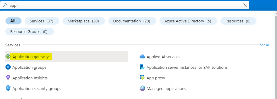 Search for Application gateways and open the Application gateways service as highlighted below.