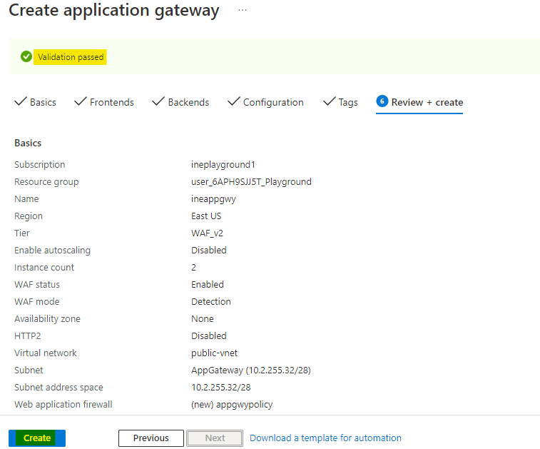 Azure will verify the configuration and it will show Validation passed if everything was configured properly. Click on Create to provision the application gateway.