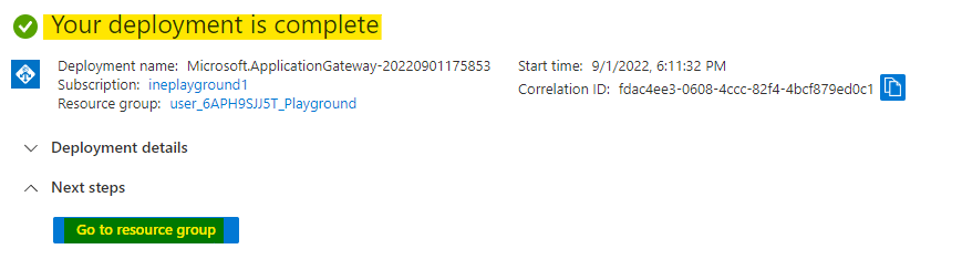 It will take few minutes to deploy the application gateway. Check after 5 to 10 minutes. You will see Your deployment is complete which means appgateway is provisioned. You can click on Go to resource group to check all the resources.