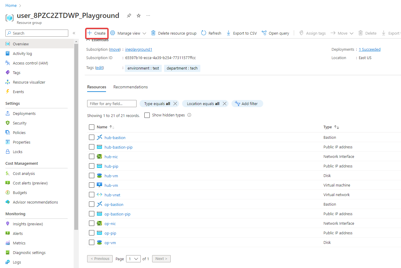 When you log in to Azure with the provided credentials, you will find all the pre-requisite setups available in the resource group. Now click on Create.