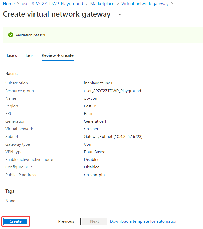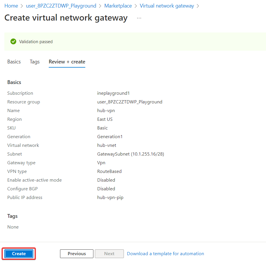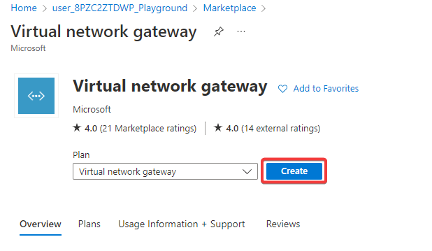 This page will provide an overview of the virtual network gateway. Now click on Create.