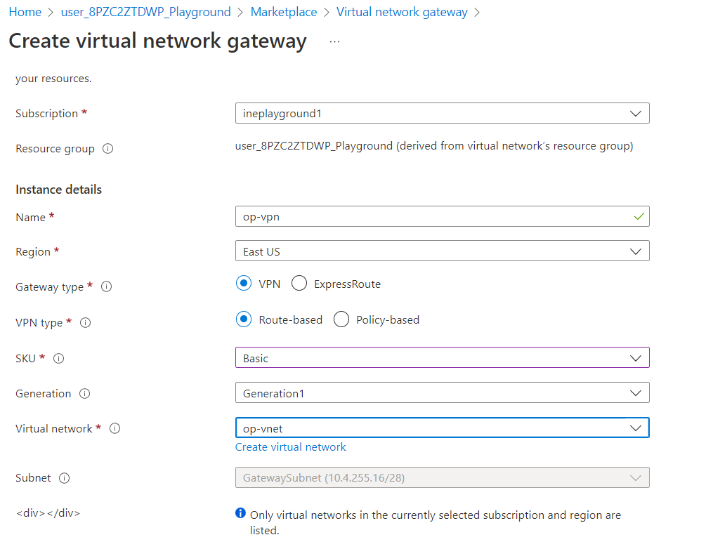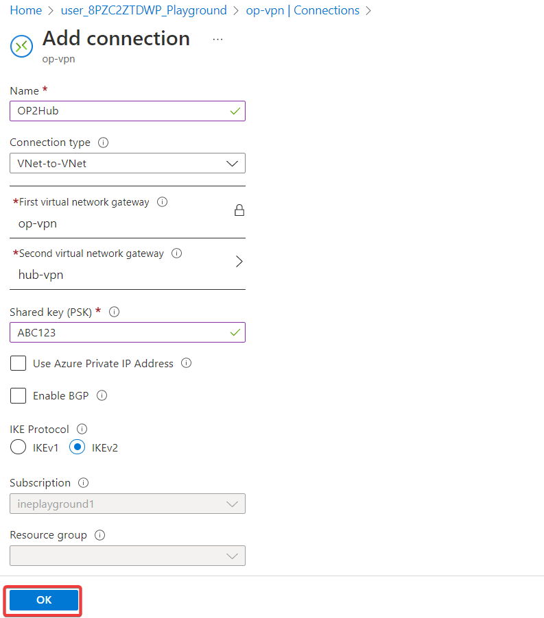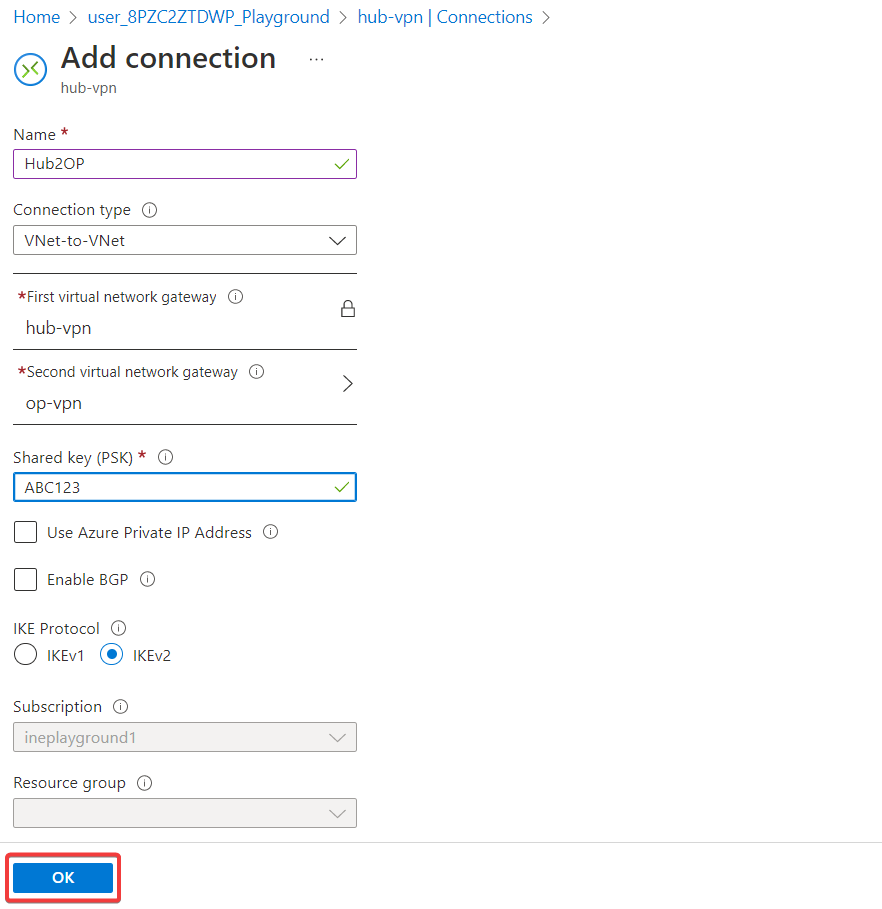 Configure the following settings and create a virtual network gateway connection and click on OK.