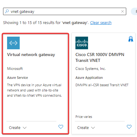 Now create the second virtual network gateway. Navigate back to the virtual network gateway in marketplace and click on Create.
