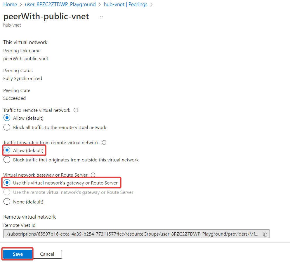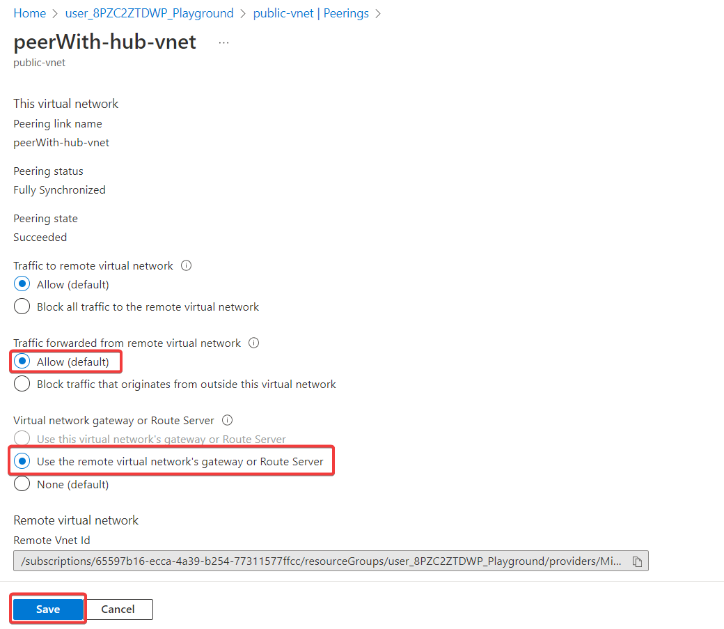 Configure the peer settings as the following and click on Save. - Allow the traffic forwarded from remote virtual network. - Select Use this virtual network's gateway or Route Server for virtual network gateway or route server.