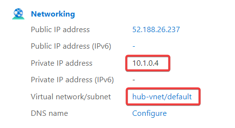 Notice the private IP address and virtual network connected. This VM is connected to hub-vnet.