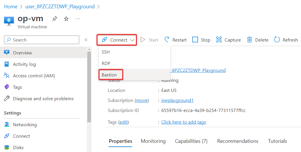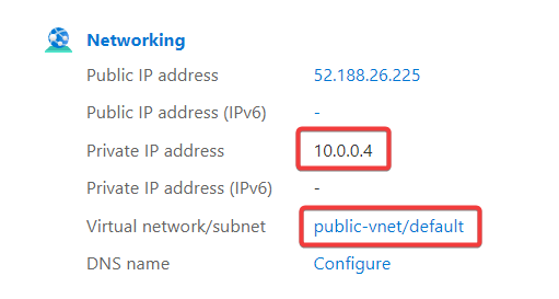 Notice the private IP address and virtual network connected. This VM is connected to public-vnet.