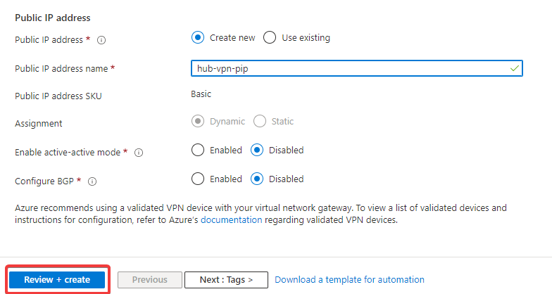 Select Create new in public IP address. Set IP address name as hub-vpn-pip and click on Review + create.