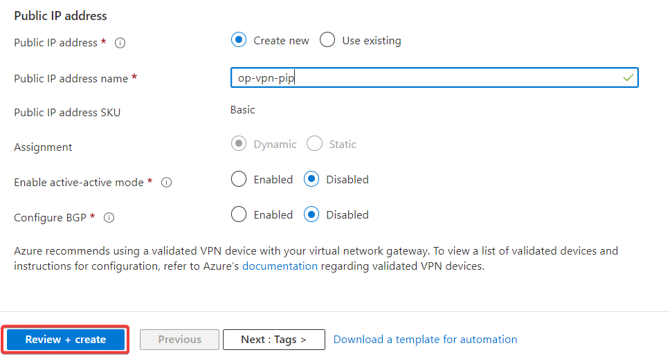 Select Create new in public IP address. Set IP address name as op-vpn-pip and click on Review + create.