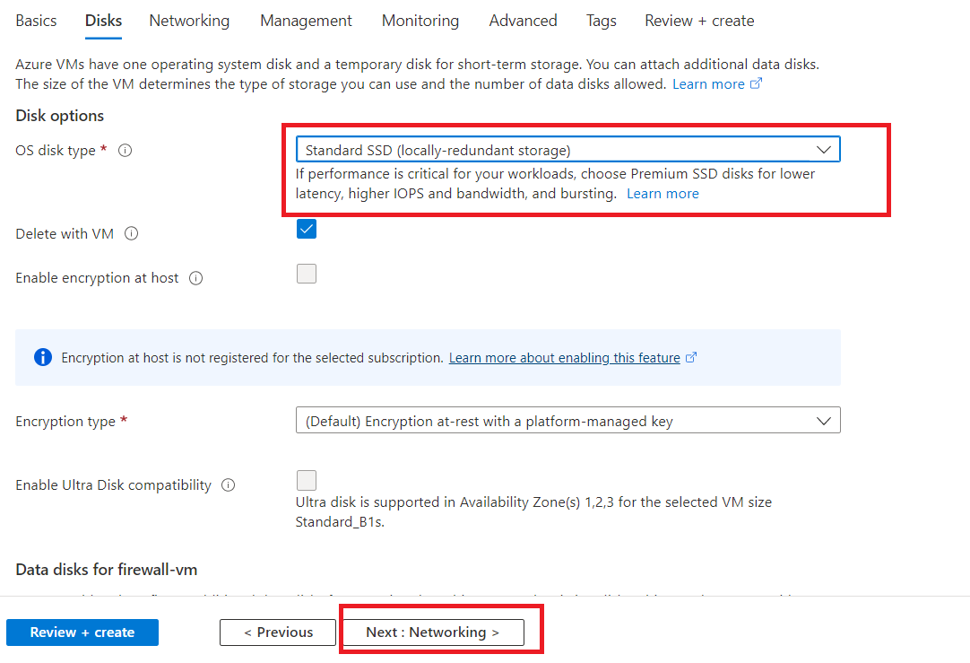 Select "Standard SSD" as OS disk type and click on "Next".