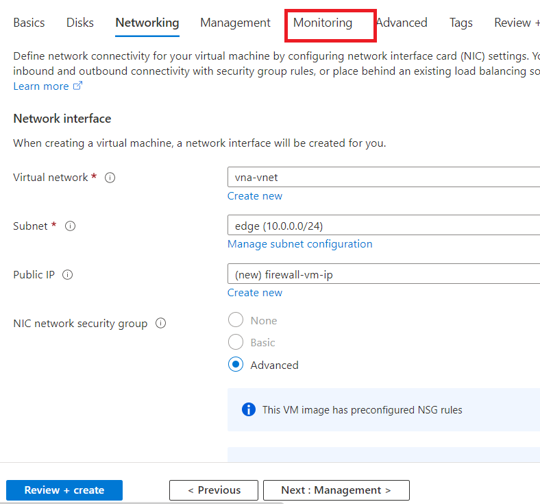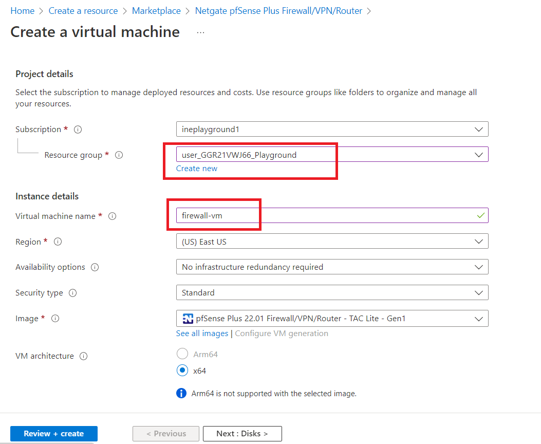In resource group select the pre-defined resource group. And give virtual machine a name e.g., "firewall-vm"