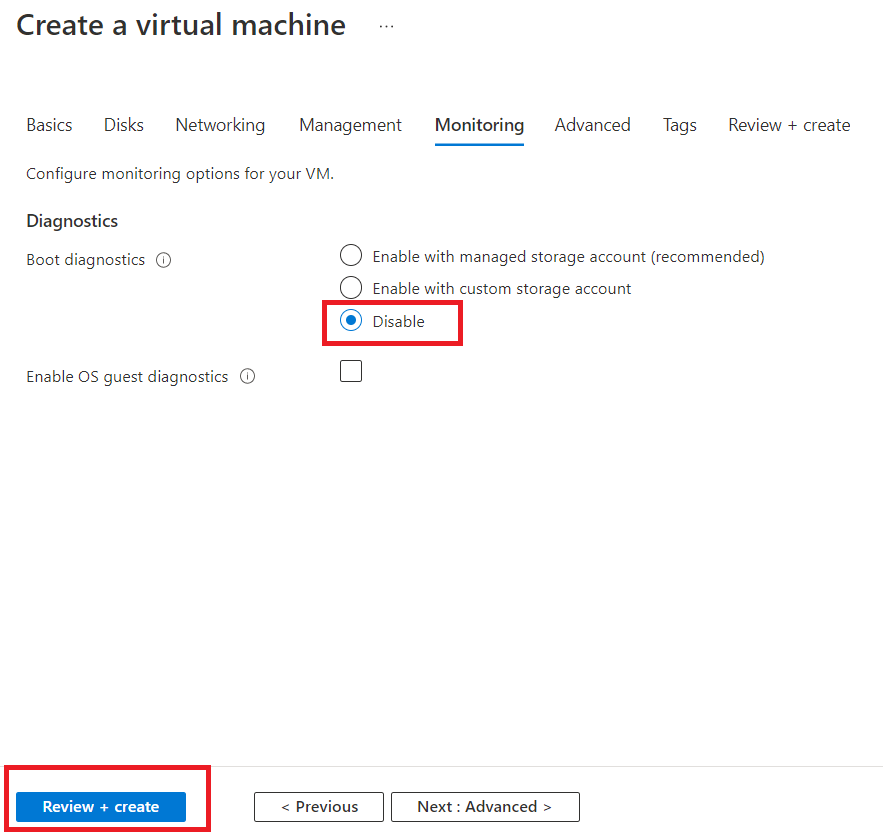 Disable the Boot diagnostics. And click on "Review + create".