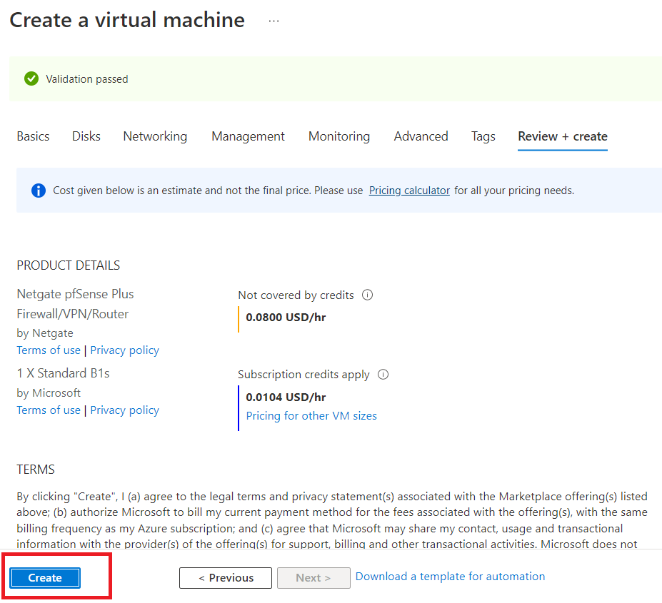 Click on "Review + create".