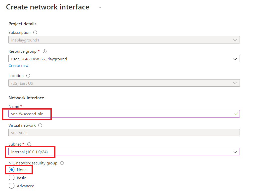 Give network interface a name "vna-fwsecond-nic" and select "internal (10.0.1.0/24)" as subnet. Now, select "None" as NIC-network security group.