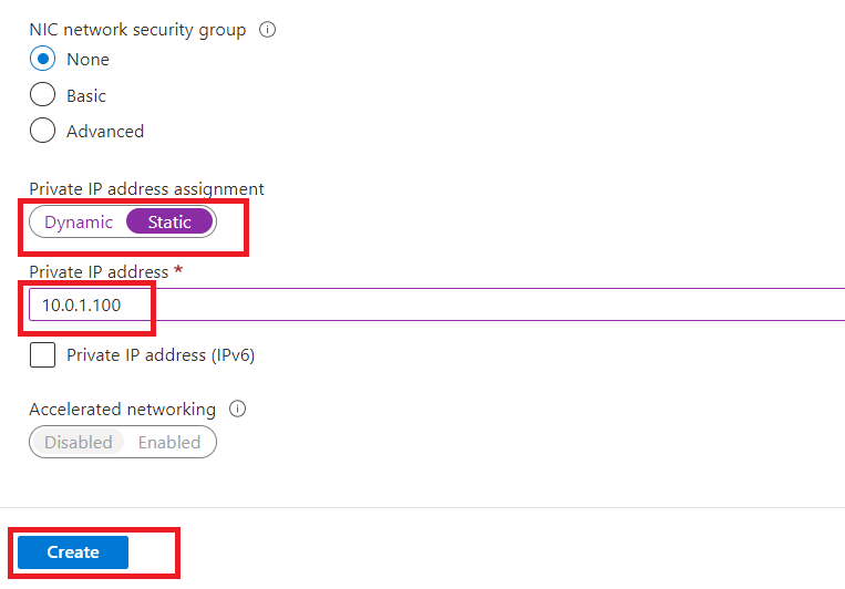 Select Private IP address assignment as "Static" and set "10.0.1.100" as Private IP Address. Now, click on "Create".