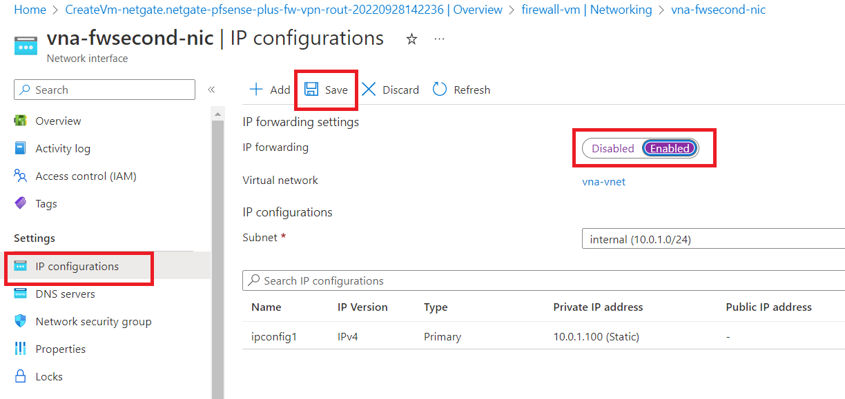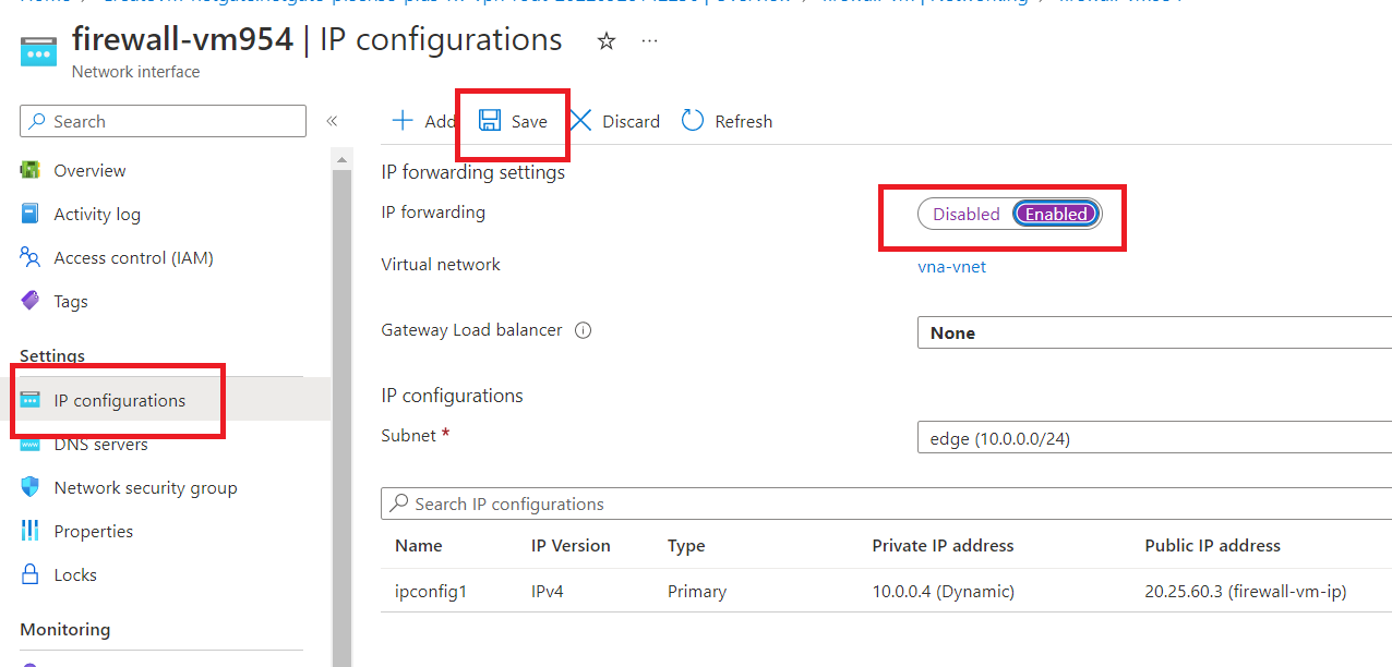 Click on "IP configurations" first, and then enable IP forwarding. Now, click on "Save".
