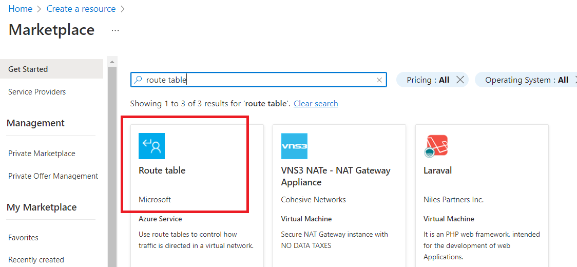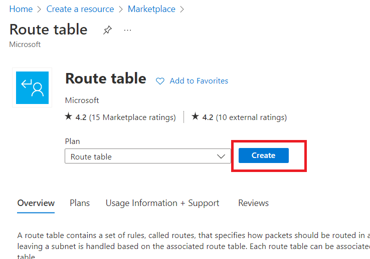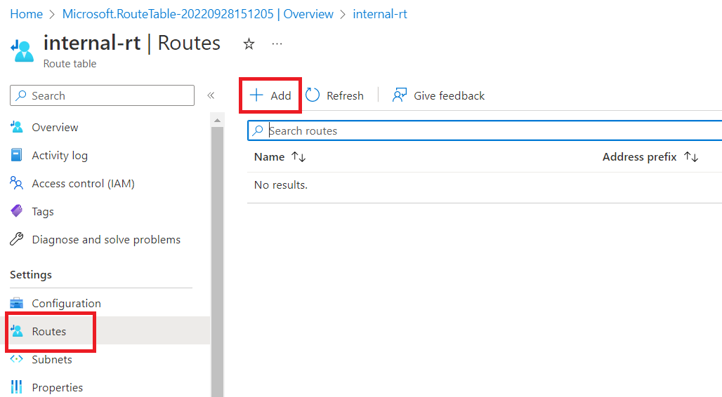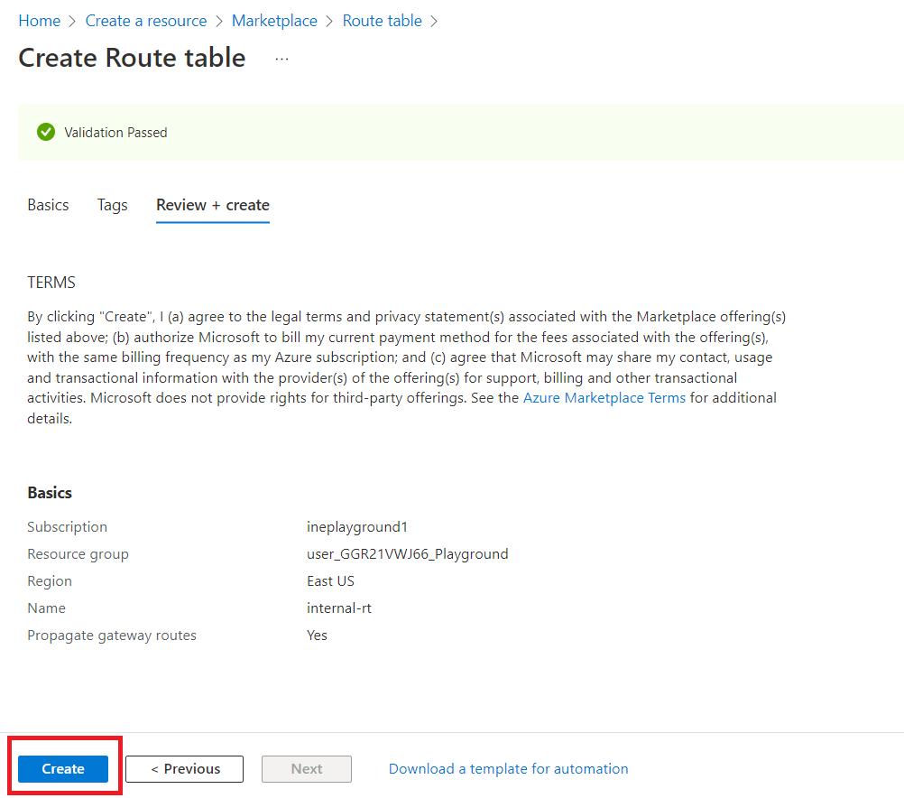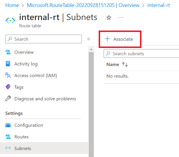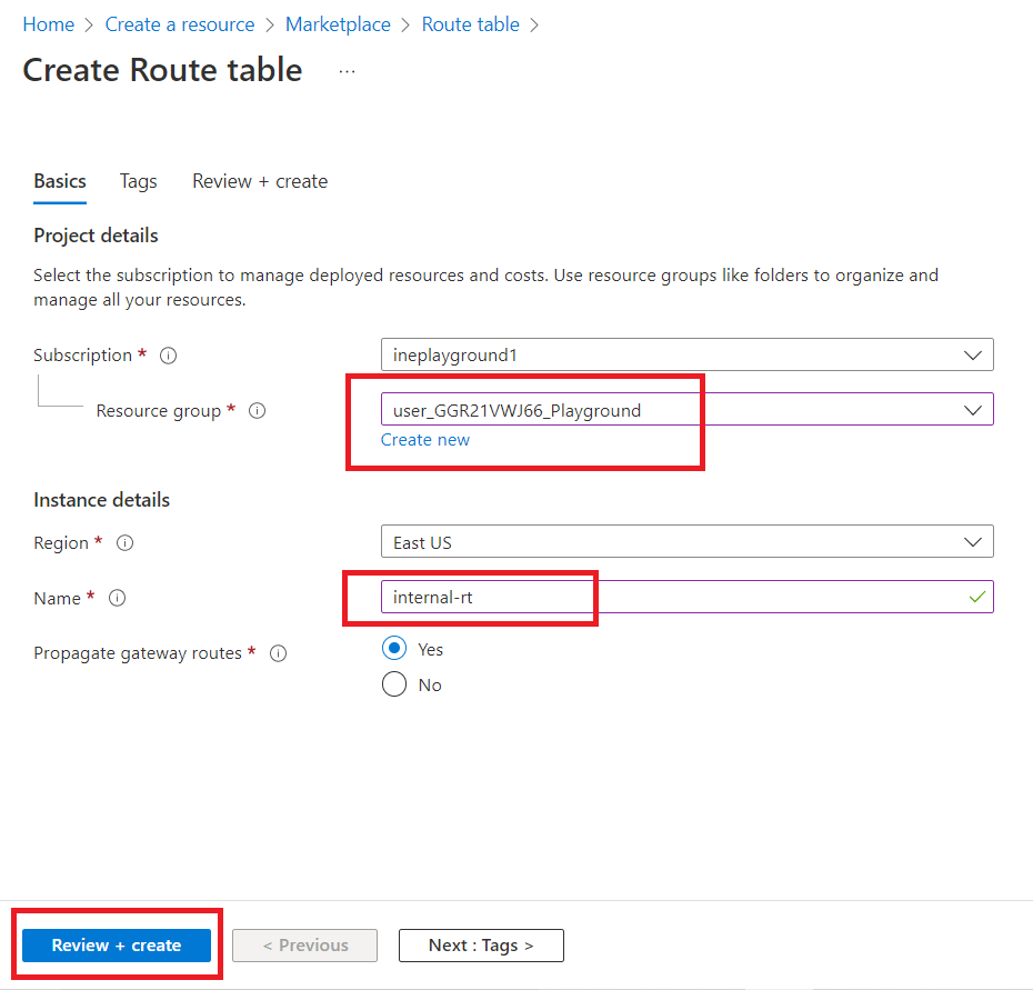 Select the resource group and give route table a name e.g., "internal-rt".