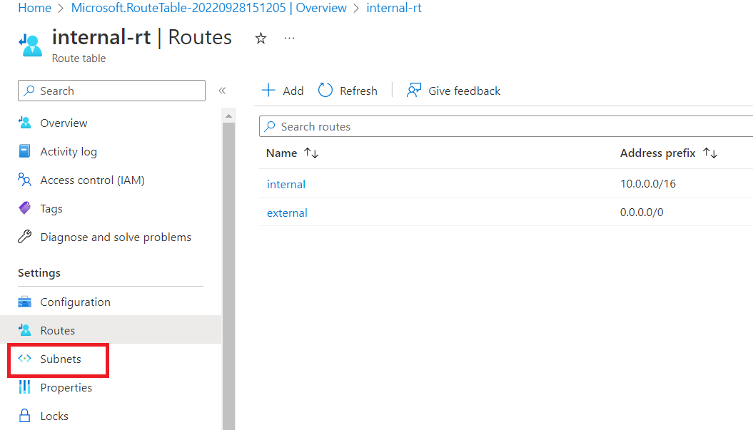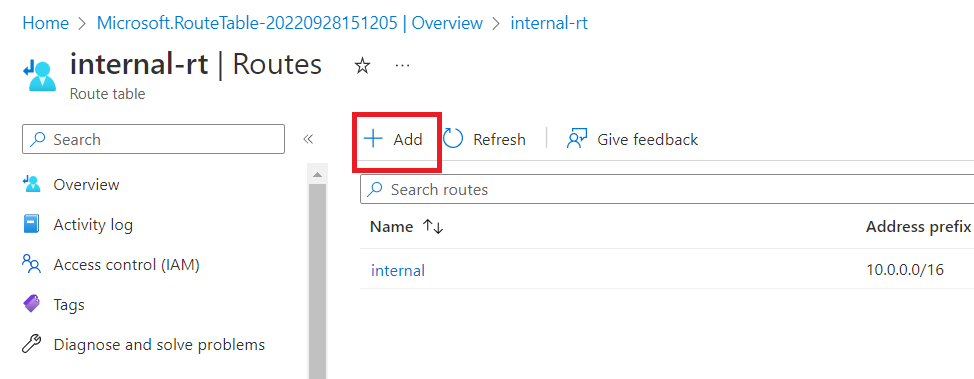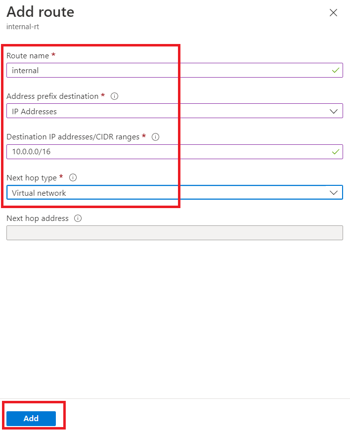 Give route name as "internal", select Address prefix destination as "IP Addresses". Destination IP addresses/CIDR ranges as "10.0.0.0/16" and Next hop type as "Virtual network". Click on "Add".