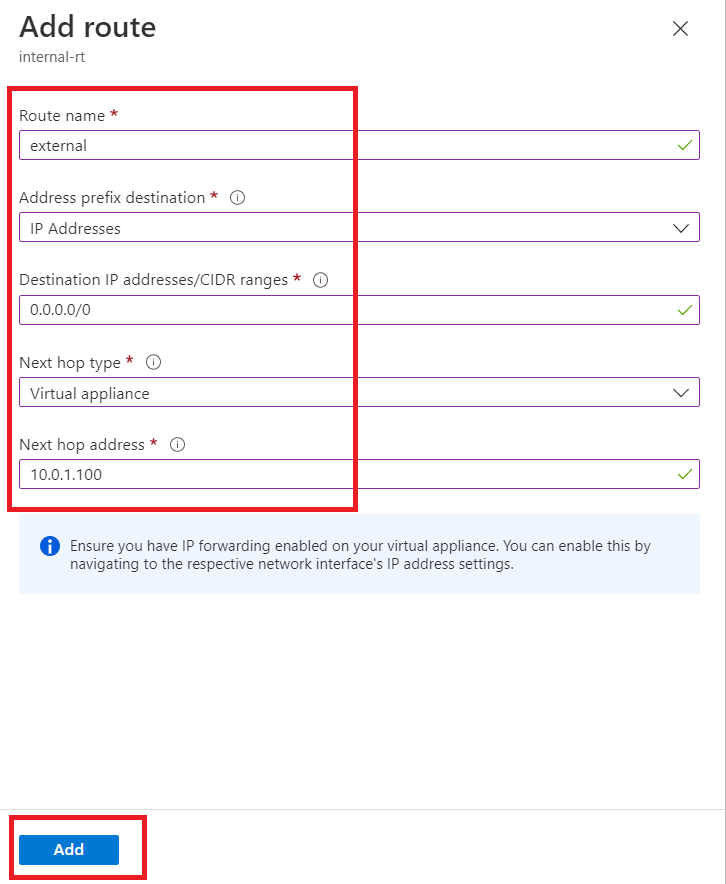 Give Route name as "external". Select Address prefix destination as "IP Addresses". Give "0.0.0.0/0" as Destination IP addresses/CIDR ranges. Next hop type as "Virtual appliance" and Next hop address as "10.0.1.100".
