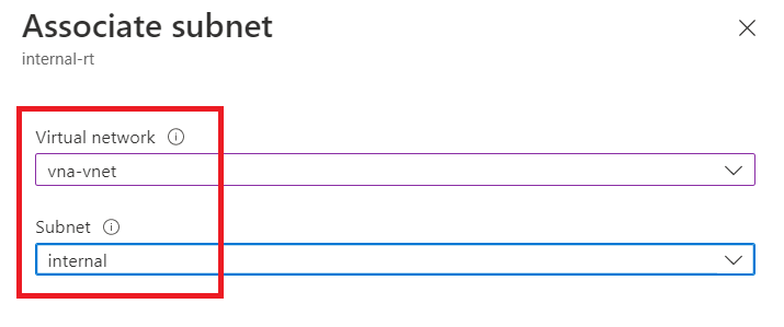 Select Virtual network as "vna-vnet" and Subnet as "internal".