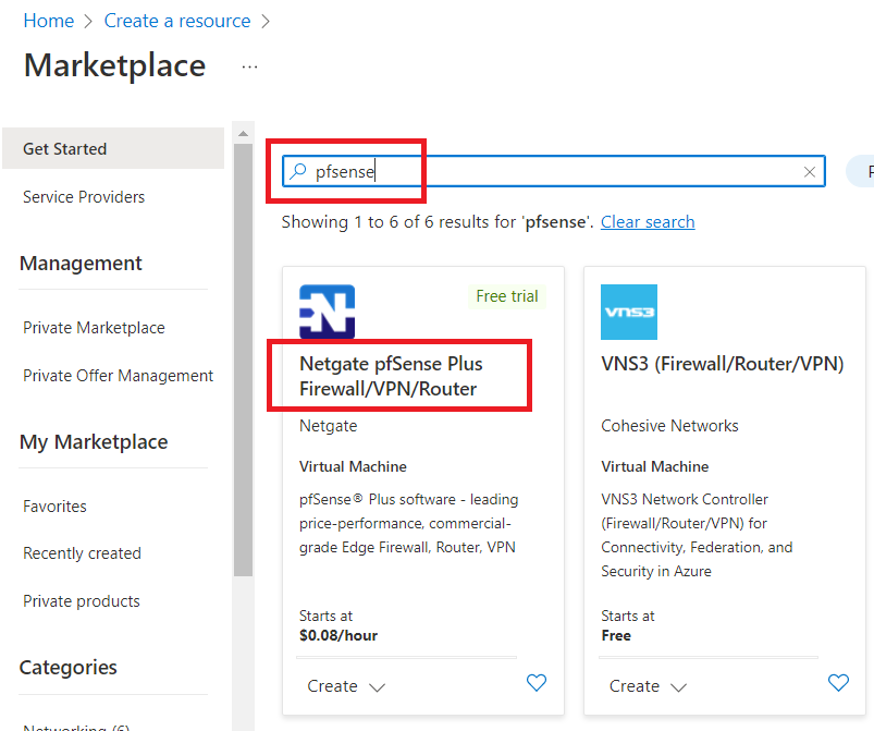 Now, type "pfsense" in the search box and click on "Netgate pfSense Plus Firewall" as shown in the below image.