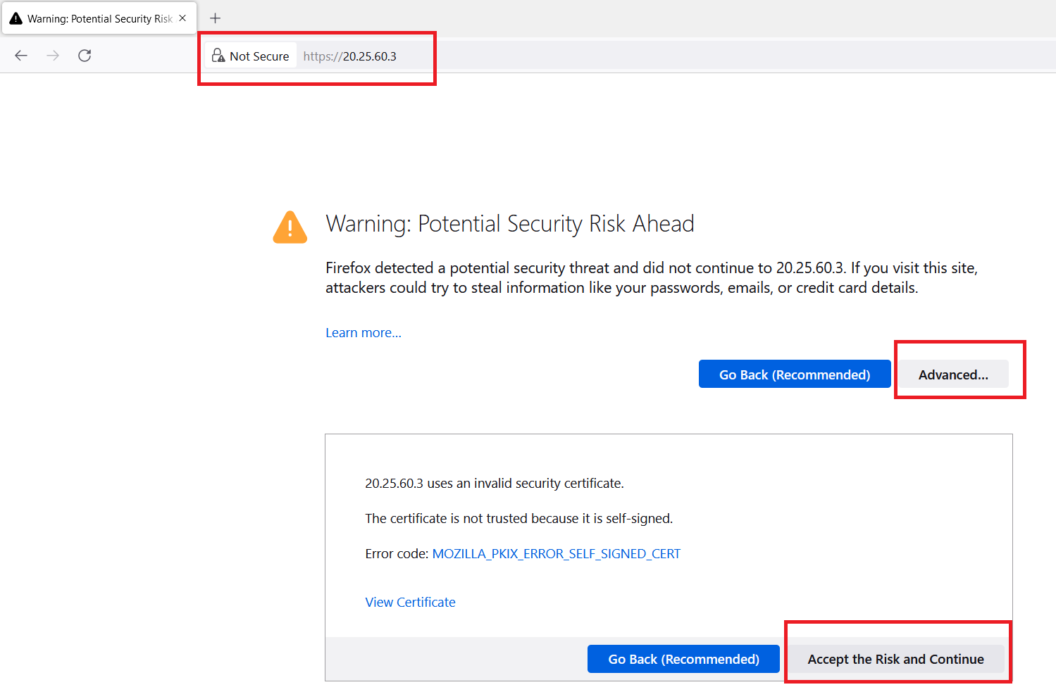 Click on "Advanced" option and click on "Accept the Risk and Continue".