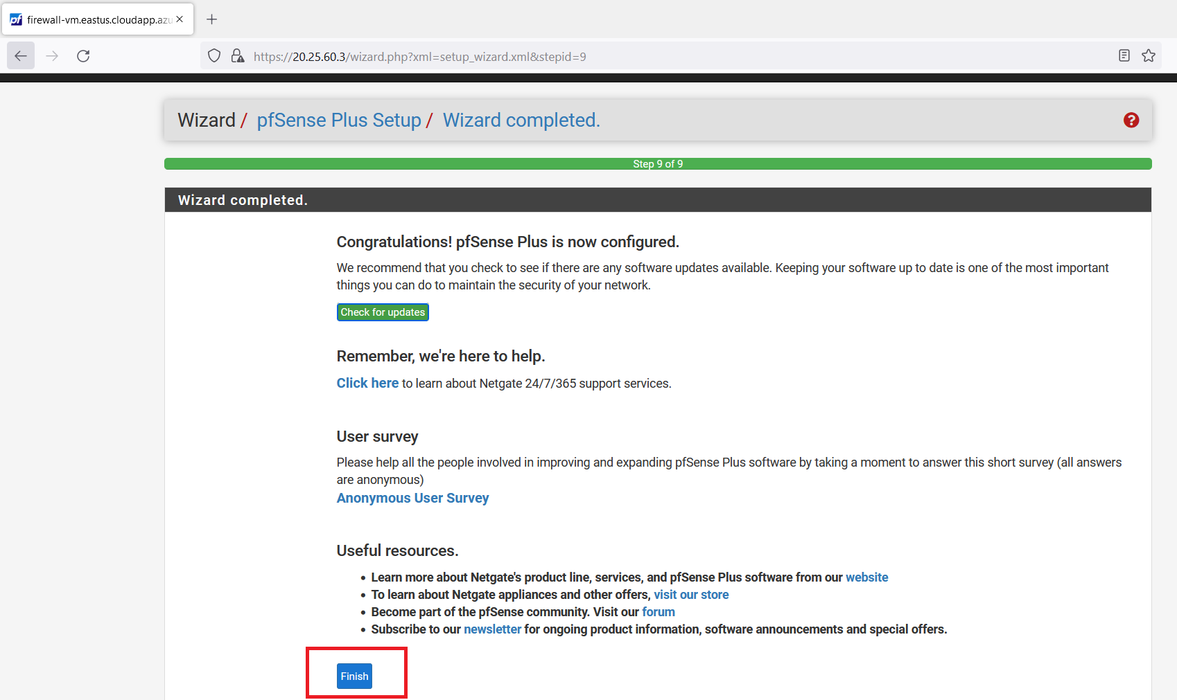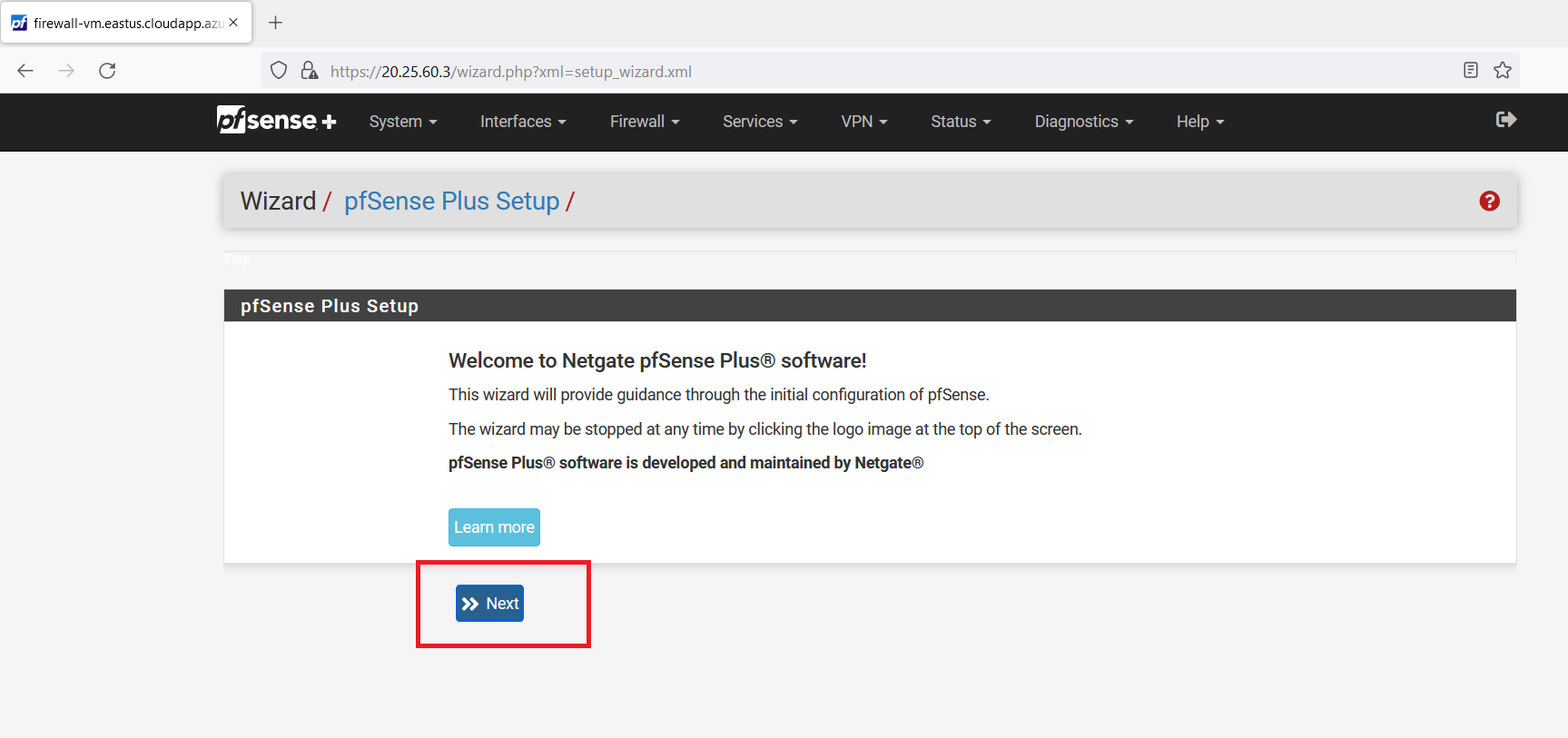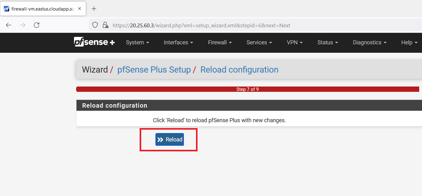Open a web browser (use firefox) and search "https://< firewall-vm Public IP Address >"