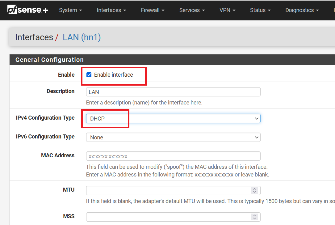 Click on the "Enable interface" and select "DHCP" as IPv4 Configuration Type.