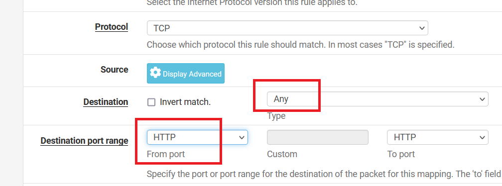 Select "Any" as Destination type. And "HTTP" as Destination port range.