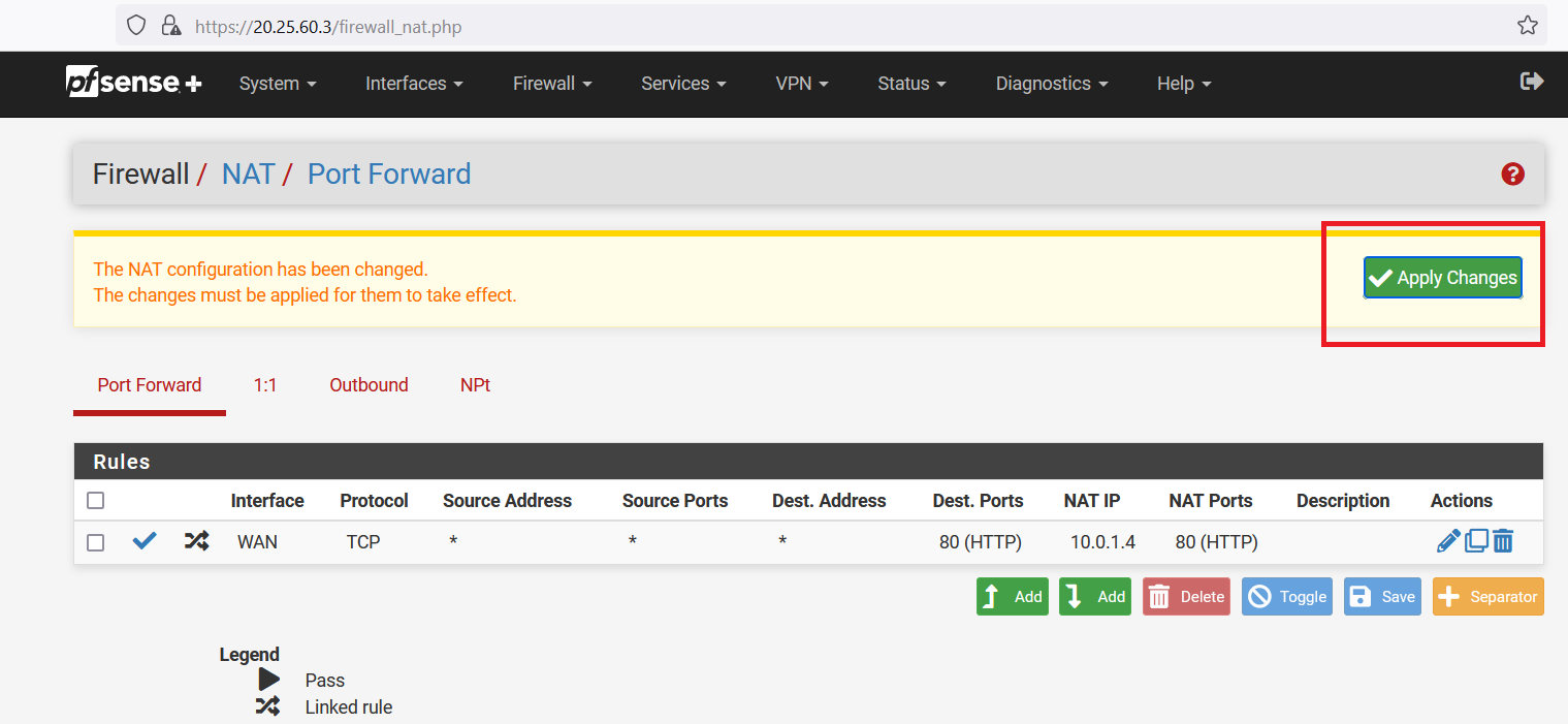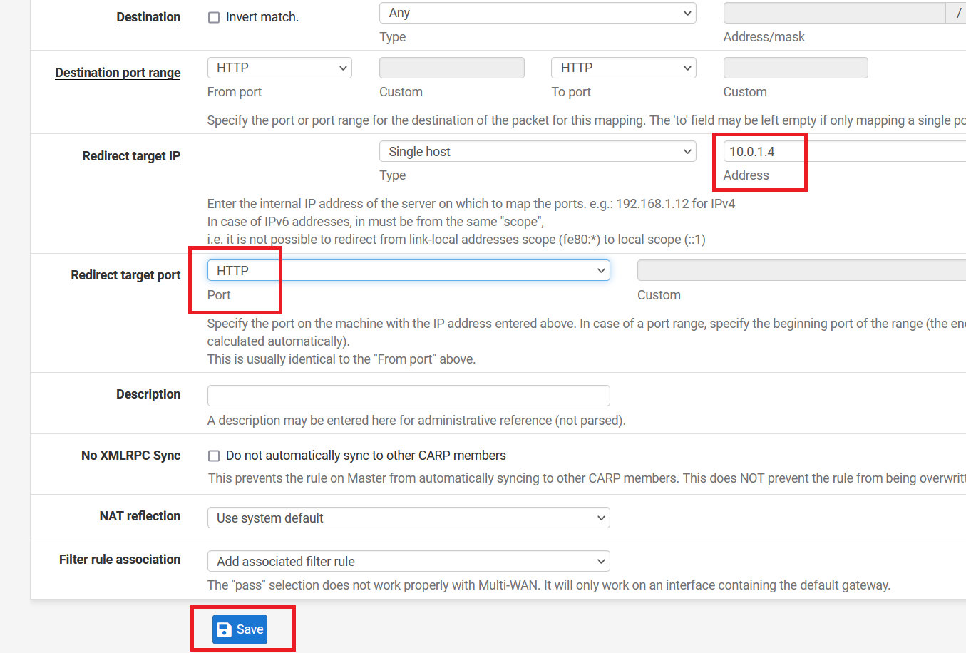 Write "10.0.1.4" as Redirect target IP. And select "HTTP" as Redirect target port. Now, click on the "Save" button.