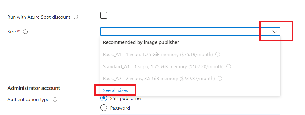 To select the size of the VM open the drop-down menu as shown below and click on "See all sizes".