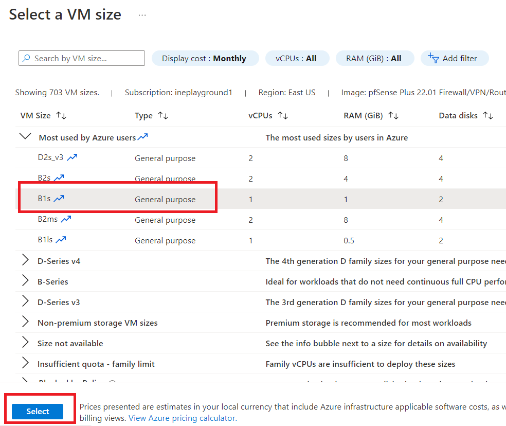 Select "B1s" and click on "Select".