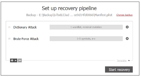 For encrypted backup files, the user can run either Dictionary or Brute-Force attacks. In this example, we attempt to crack an encrypted iOS backup file.