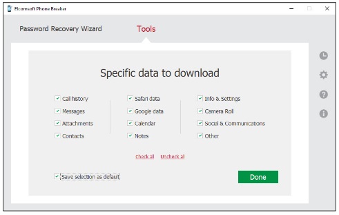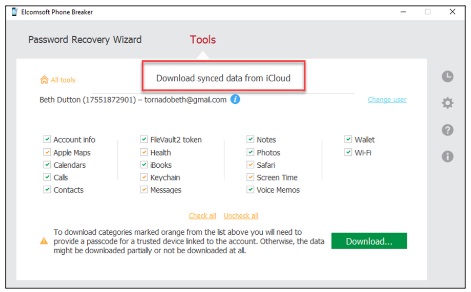 Elcomsoft has the capability of collecting data that is synced by Apple and data that is backed up by the user. In some situations, this data may be similar. However, look at the differences in what is collected. On the left, we can see some items that have an orange (or lighter shaded) checkbox. The lighter shading means the phone passcode must be entered to extract this information. That is the only thing protecting this data. When possible, collect both the Synced data from iCloud and the iCloud backup files.