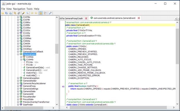JADX will feel very similar to jd-gui, and it will eliminate the steps of unpacking the .apk and converting the .dex file to a .jar before loading into the tool, which allows the examiner to view the Java source code. The tool is available for Windows, Linux, and macOS.