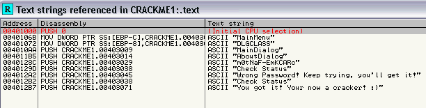 Vemos todas las cadenas de texto del crackme y entre ellas la que