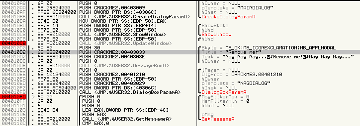 generar la ventana mala de no registrado y el Olly con Control+R nos dice que
