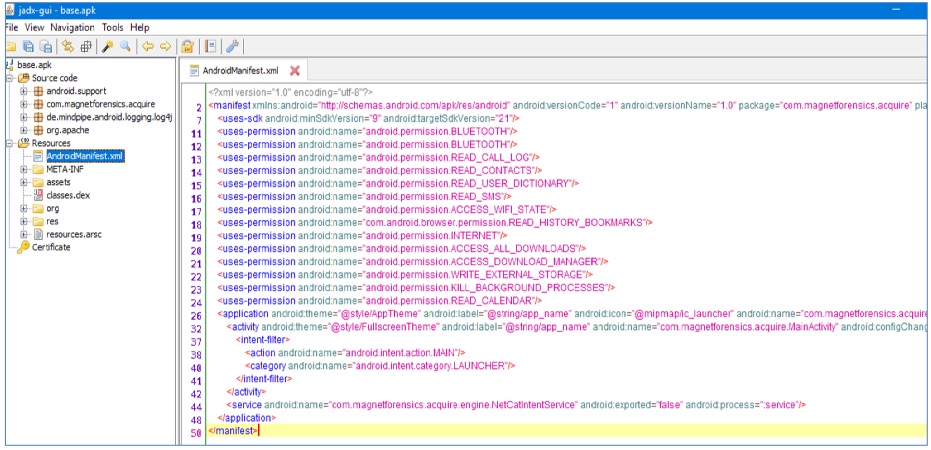 Taking a deeper look at logical remnants left behind, we have pulled the base.apk file. Here we are examining the AndroidManifest.xml for the logical acquisition agent installed while using Magnet Acquire. The APK, called base.apk, was extracted using the ADB pull methods discussed in the previous slide. Taking a closer look, we can see that Acquire installs itself in order to collect call logs, contact, dictionary, SMS, Wi-Fi-/Bluetooth, Browser information, calendar, and background processes. Essentially, it installs itself, grants the permissions required to access content commonly pulled during acquisition, and then collects it. So, you get a logical report, but no actual data. In reality, this may be the best we get other than ADB acquisition pulls.