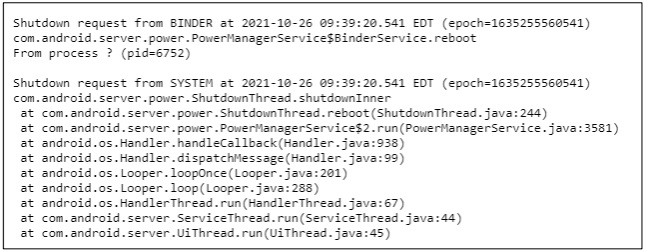 Shutdown checkpoints are stored in USERDATA/system/shutdown-checkpoints. The files are named �checkpoint-UNIXEPOCH�, and the files are in plain text. The timestamp in file name aligns with Modified time of file.� The shutdown checkpoints keep a log of when the phone was shutdown/rebooted. Something worth noting is� that the time is stored in local time and can also provide a reason for the shutdown (e.g., dead battery). Kevin Pagano wrote a blog on this: https://www.stark4n6.com/2022/01/shutdown-checkpoints-in-android-12.html