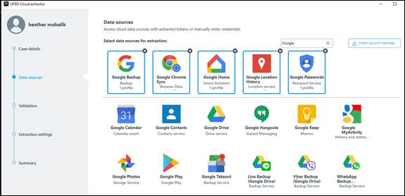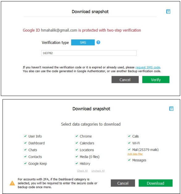 Google provides 15 GB of free storage space to users. Keep in mind this is available to even non-Android device users. Thus, Google cloud artifacts are likely to be relevant to most mobile investigations. Make sure you have proper authorization to access cloud data. If you overstep boundaries, you risk having your case thrown out and even ruining your reputation or your career. In order to use these tools, you must have the user�s Gmail address and password.