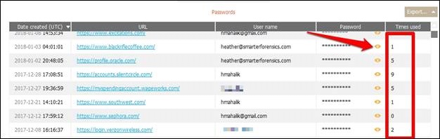 Here is an example of what Chrome stores for us. In addition to the normal browser history, Chrome keeps track of all the passwords you ask it to �save� for you. Above, we can see several of my usernames and passwords. To see the password, simply click on the eye! Nothing else is needed to view these. The times used shows how frequently I used Chrome to log into something without me having to enter my credentials manually. Scary, right? But amazing for the investigations we work! Remember, humans are creatures of habit. We love to reuse passwords. Keep a running list of passwords for the case you are working, as you never know when they will enable access to other data of interest.