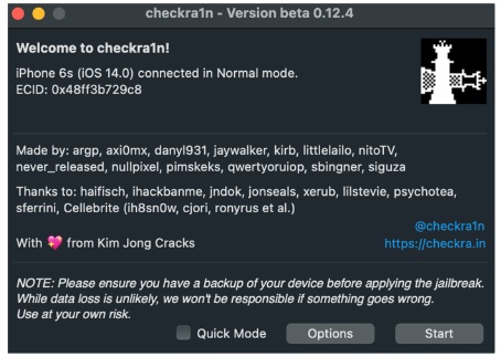 Once you jailbreak your device with checkra1n, you have a tethered jailbreak. This means the jailbreak is tethered to power. If it loses power, you must re-jailbreak the device. In this example, the device was jailbroken on a Mac using checkra1n.