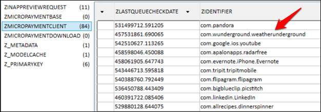 The /Library/com.apple.itunesstored/itunesstored2.sqlitedb stores apps that were downloaded via iTunes. This may contain traces of deleted applications. In the example in the slide, com.wunderground.weatherunderground was deleted by the user.