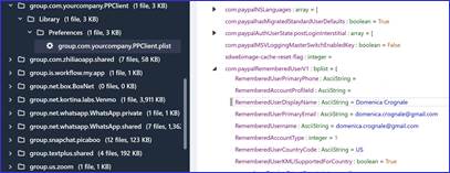 PayPal has seemingly followed the lead or perhaps started the trend seen amongst other mobile banking applications. While some references to the account owner are still contained in a plist file on iOS devices, many pertinent details are not included in this application repository any longer.