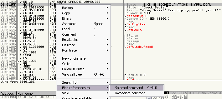 el crackme en el Olly y con click derecho Search for � All referenced text